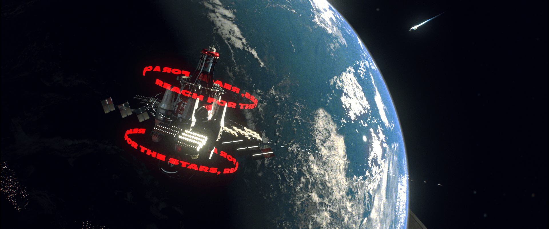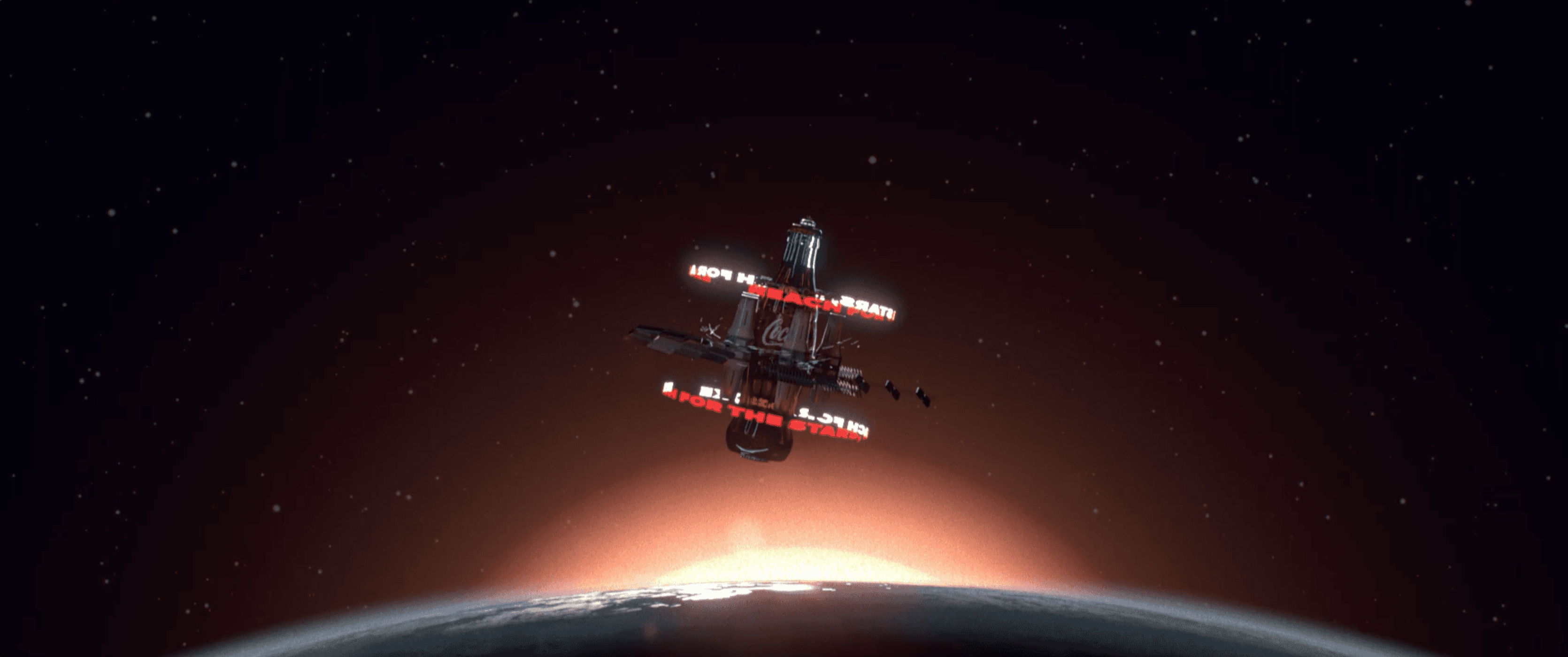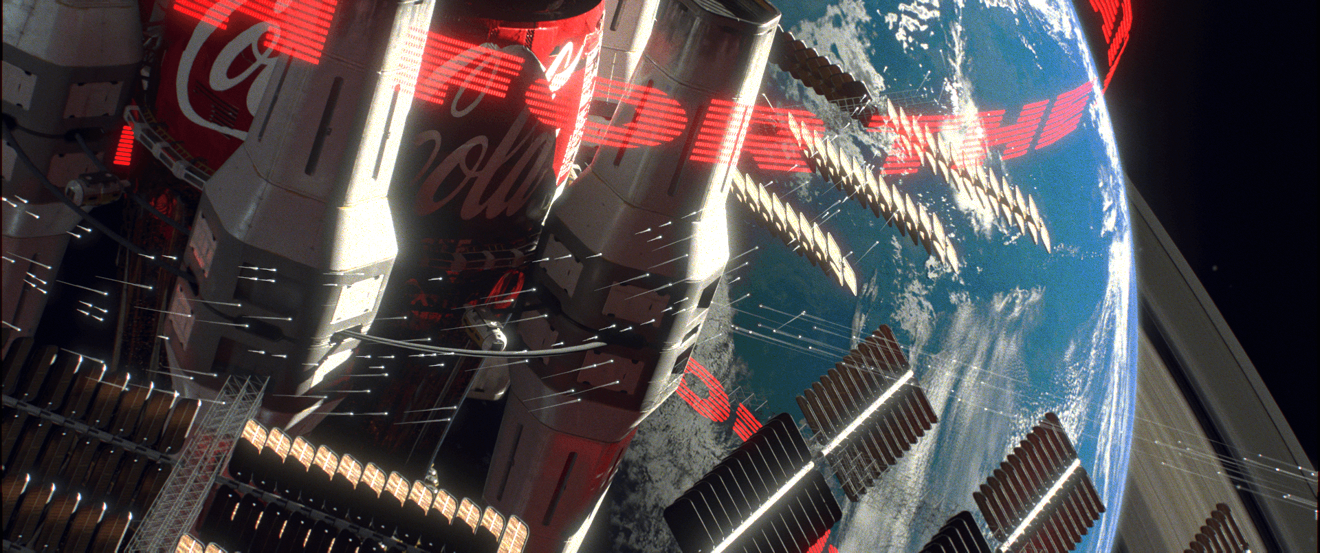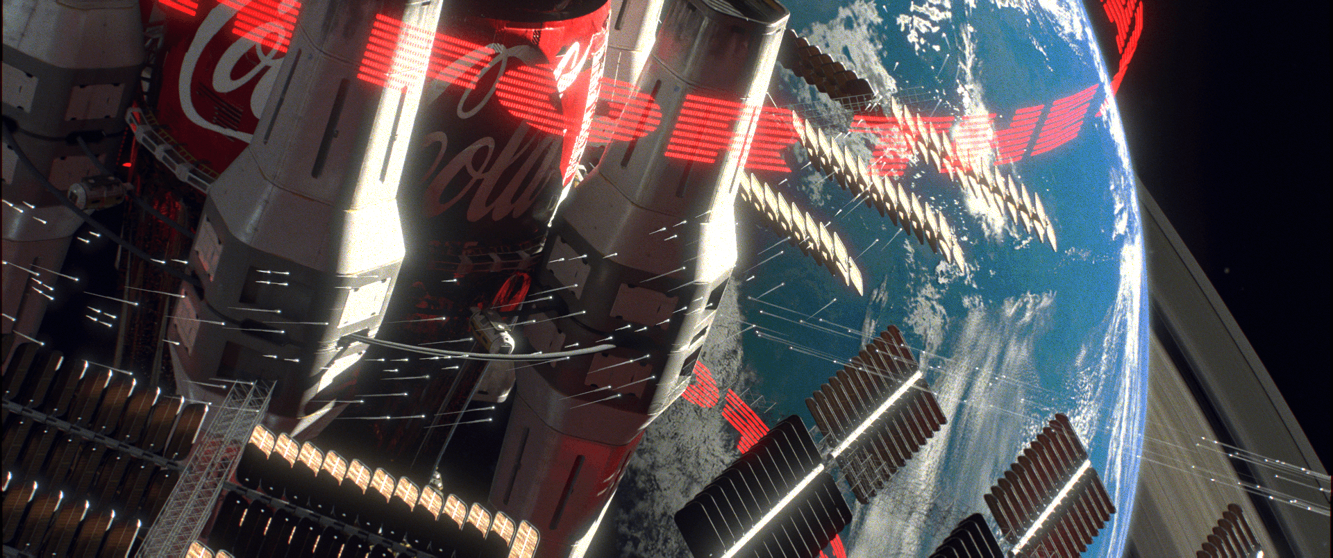 The ad concept imagines a massive Coca-Cola bottle as a space station where travelers fuel up before venturing into the stars. Inspired by Cowboy Bebop, the full ad would follow the fueling process and show Coca-Cola powering a hyperlight portal. This proof of concept focuses specifically on the space station itself, establishing the look, mood, and atmosphere of that larger story.